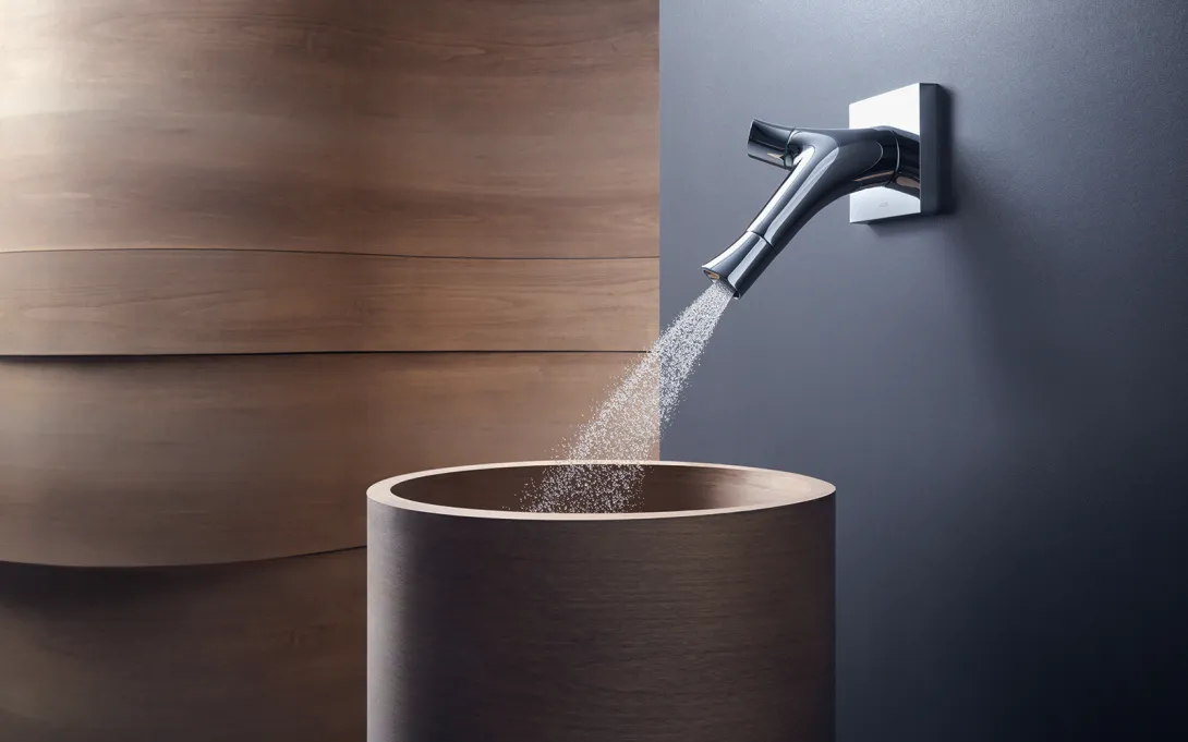 Eine moderne Wasserarmatur mit mehreren austauschbaren Abdeckplatten in verschiedenen Farben und Materialien, die übereinander schweben.