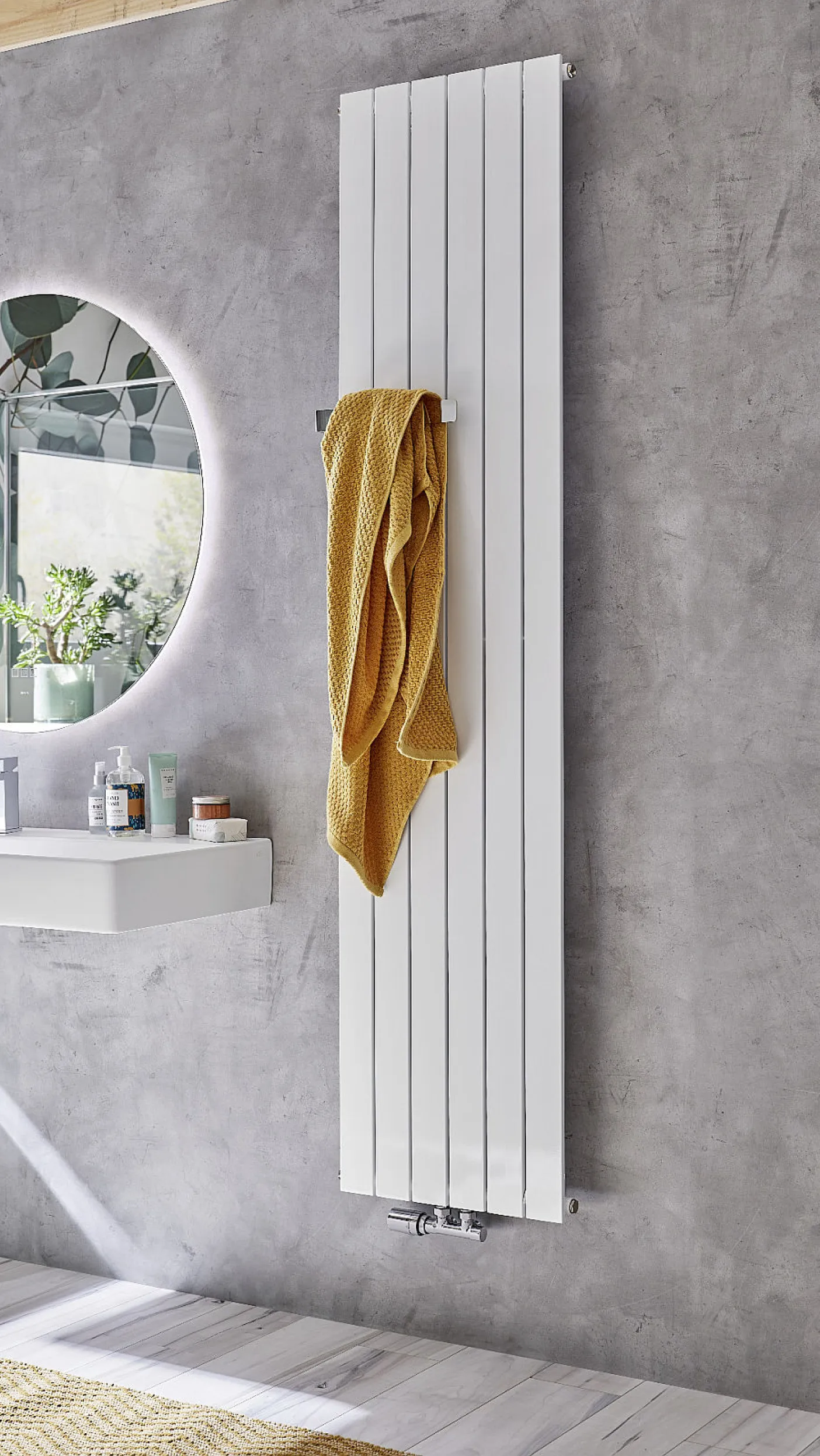 Ein vertikaler HSK Designheizkörper in Grau, an einer eleganten Marmowand montiert, mit Handtuch und Ausblick durch ein großes Fenster.