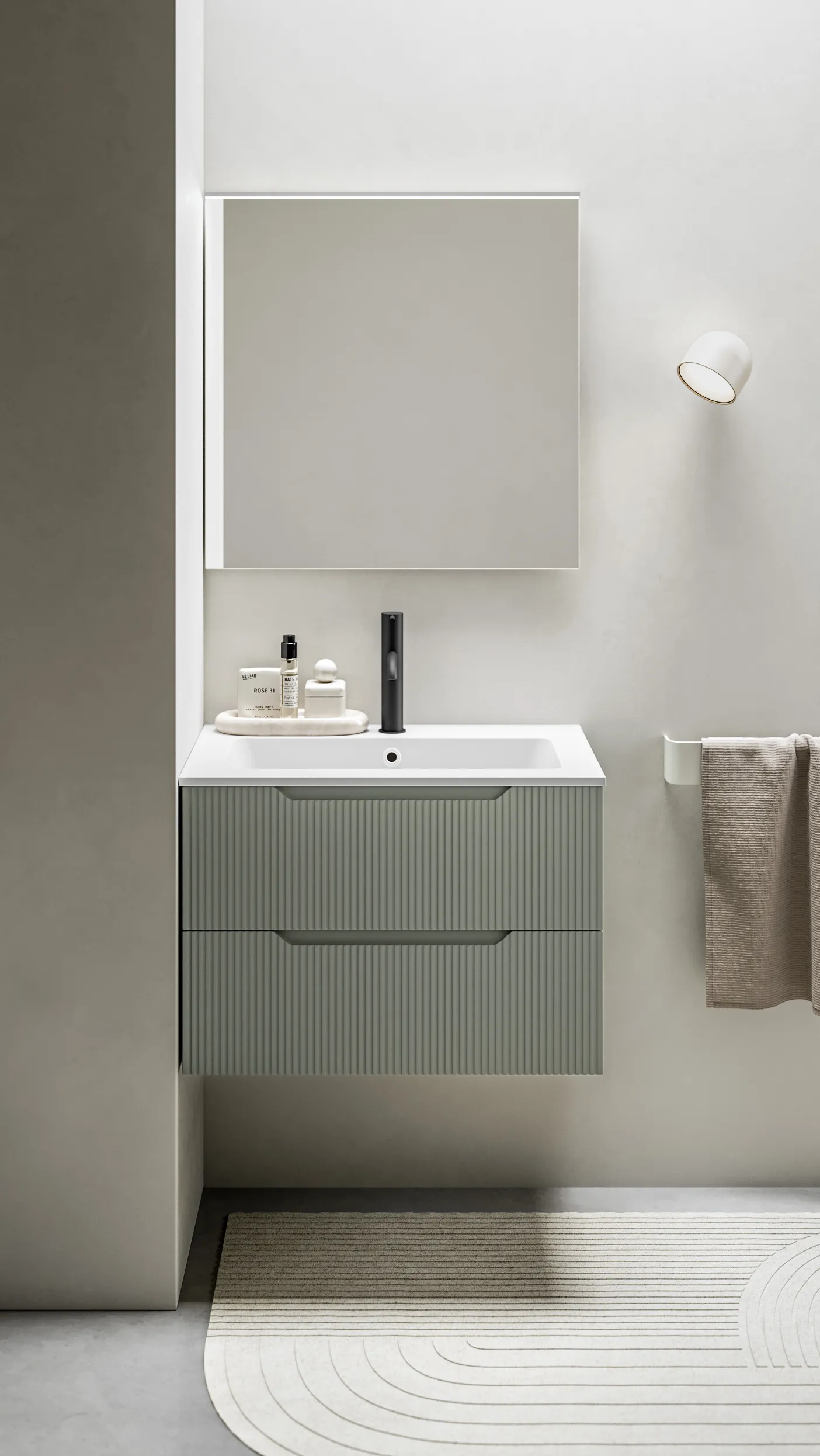 Die Badmöbelserie .Bravo verleiht dem Badezimmer mit seiner markanten geriffelten Frontstruktur und den grafisch integrierten Griffmulden einen einzigartigen Charakter. Eine Serie, die modernes Design mit hoher Alltagstauglichkeit verbindet.