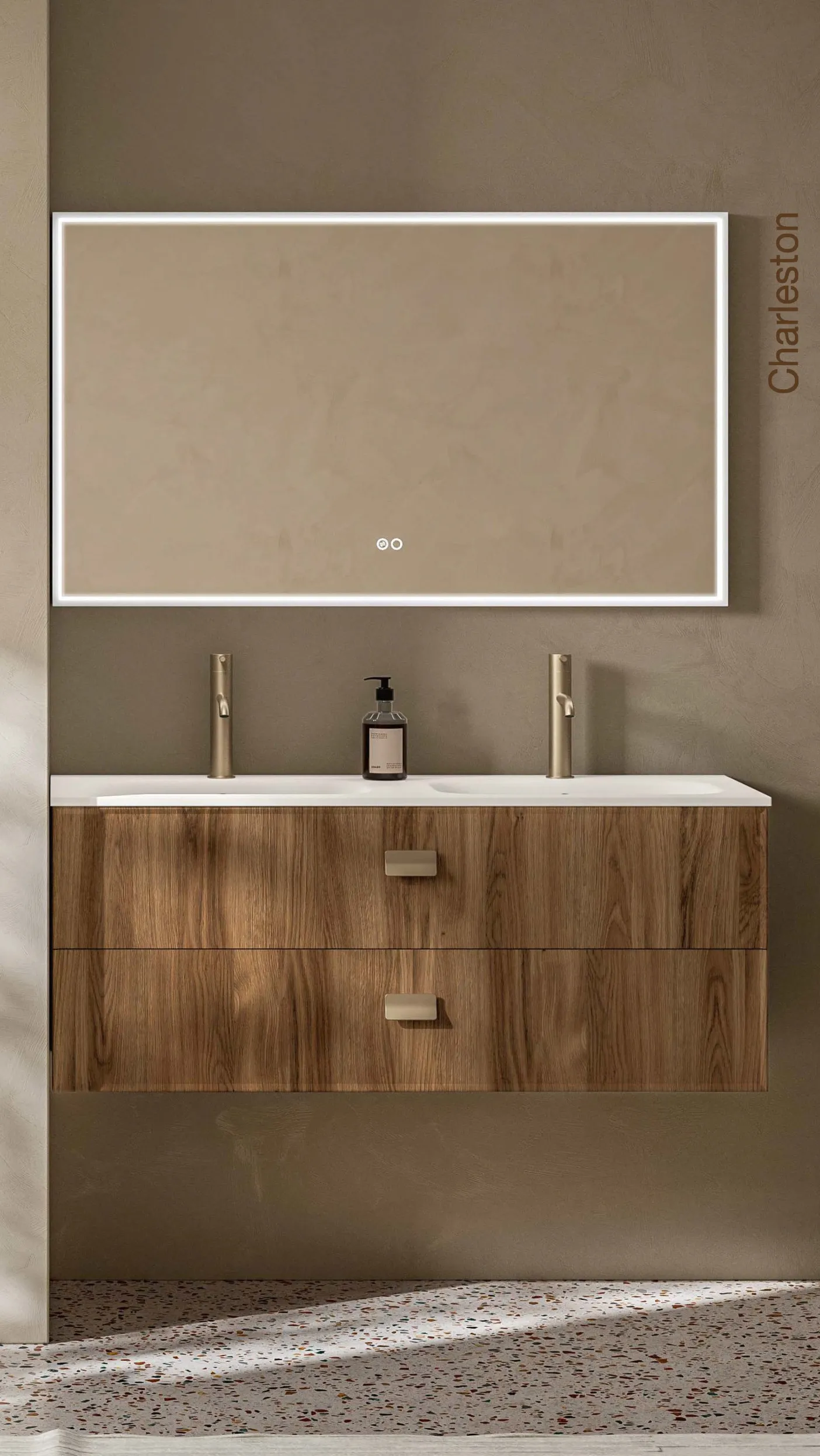 Wandhängendes Badmöbel in Beige mit Chromgriffen, beleuchtetem Spiegel und bodengleicher Dusche.