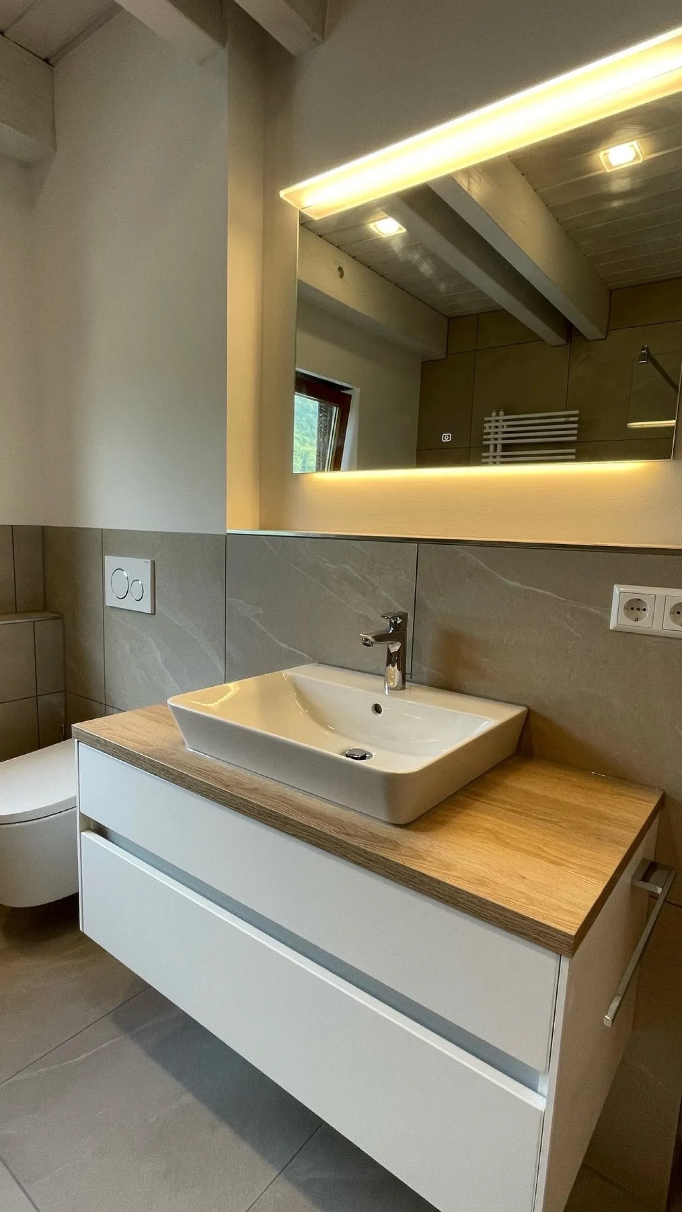 Da die Familie Maier nun über 25 Jahre im selben Bad verbracht hat, kam für sie der Wunsch nach einem Tapetenwechsel auf. Aus dem vorher eher kühl gestalteten Bad, haben wir mithilfe von wärmeren Farbtönen bei Fliesen und Badmöbeln eine kleine Wohlfühloase geschaffen.